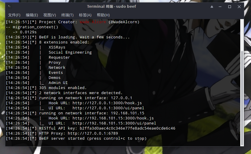 接下来启动 beef ,和上面说的一样要加 sudo 。