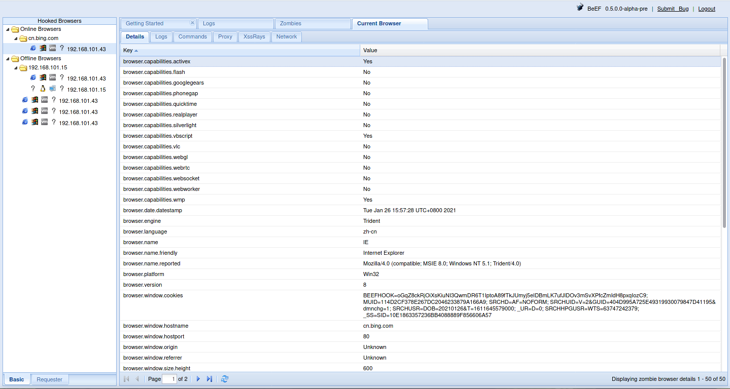 - 这个就是上面所说的钩子地址了,浏览器一旦访问了带这些js的页面就会被 beef 勾住~